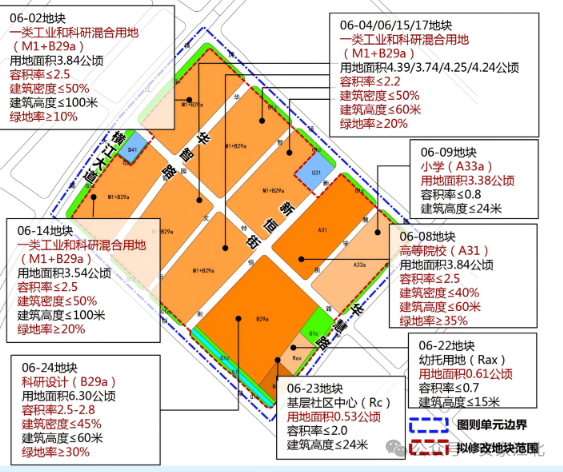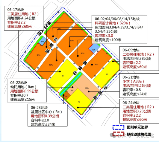 06-22幼托用地、06-23基层社区中心用地、06-21小学用地、06-24二类居住用地变更为科研设计、基层社区中心、幼托用地以及绿地。