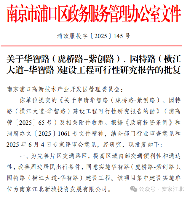 无独有偶,就在12月,关于华智路(虎桥路-紫创路)、园特路(横江 大道-华智路)建设工程可行性研究报告的批复。