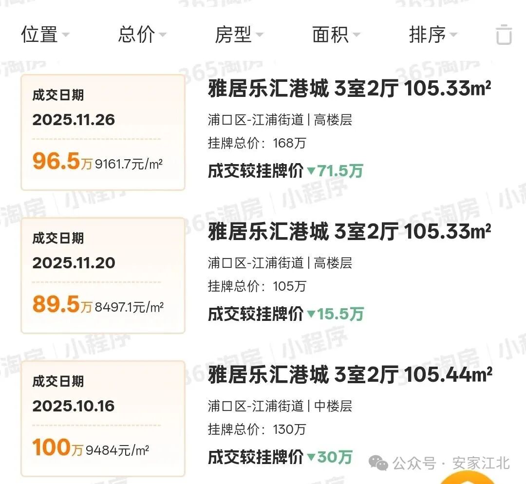 目前小区二手房成交均价大约为1万/㎡左右,其中11月20日的一套105㎡房源,成交总价为89.5万,成交单价仅为8497元/㎡,相较于项目首开约2.8万/㎡的价格,跌幅较为明显。